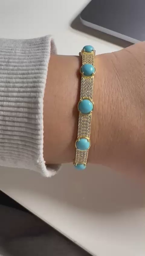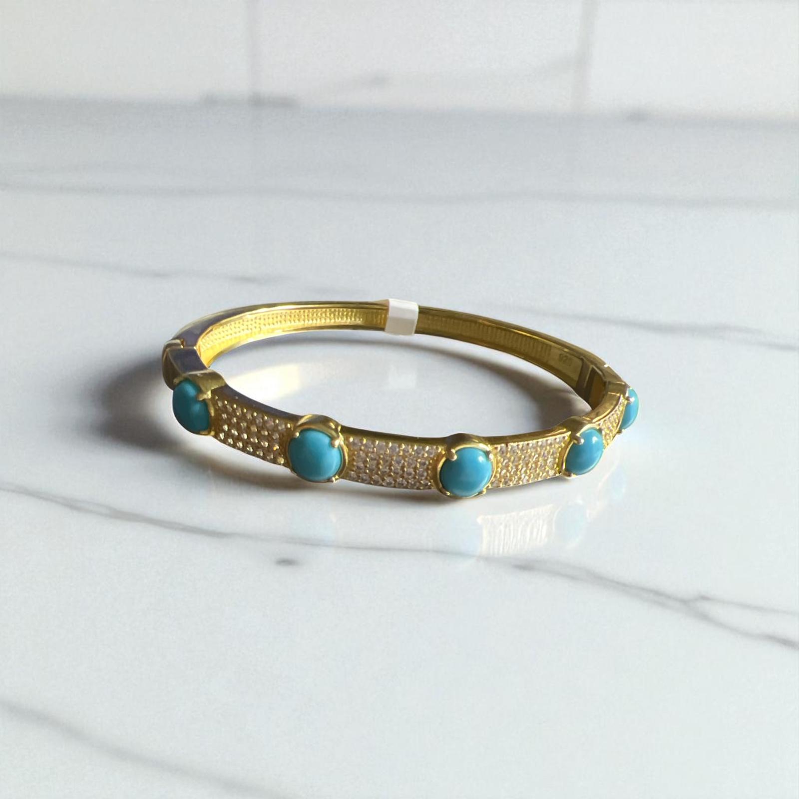 This exquisite bangle combines the warmth of 14k gold plating over sterling silver with the vibrant hues of turquoise stones, accented by sparkling CZ diamonds. Expertly crafted, it offers both durability and elegance, making it a refined addition to any jewelry collection. The turquoise brings a unique pop of color, while the CZ diamonds add subtle brilliance, perfect for elevating your style with a touch of sophistication.