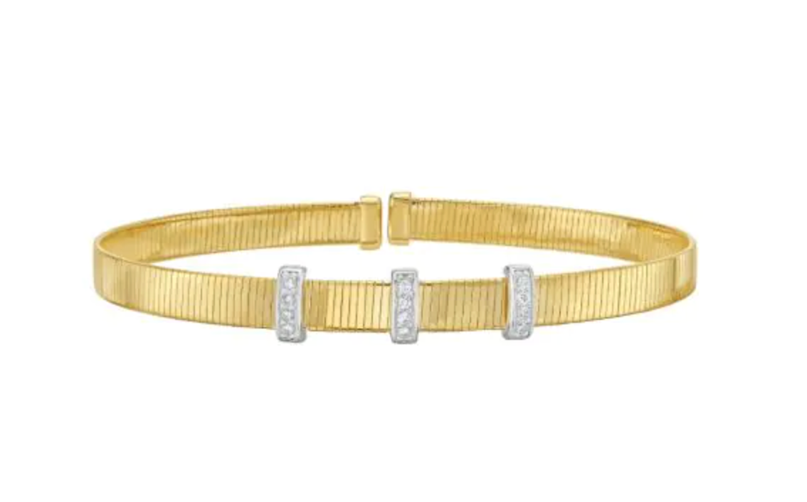 This 14K yellow gold cuff bracelet showcases a polished diamond station bar design with timeless elegance. Featuring a .11ct diamond set in a classic omega cuff style, it combines refined craftsmanship with versatile sophistication. The center element measures 9.1mm length by 11.4mm width, while the 6.5mm-wide bracelet band ensures comfortable everyday wear. Perfect for layering or wearing solo, this piece transitions seamlessly from casual to formal occasions, offering a subtle yet striking statement of luxury.