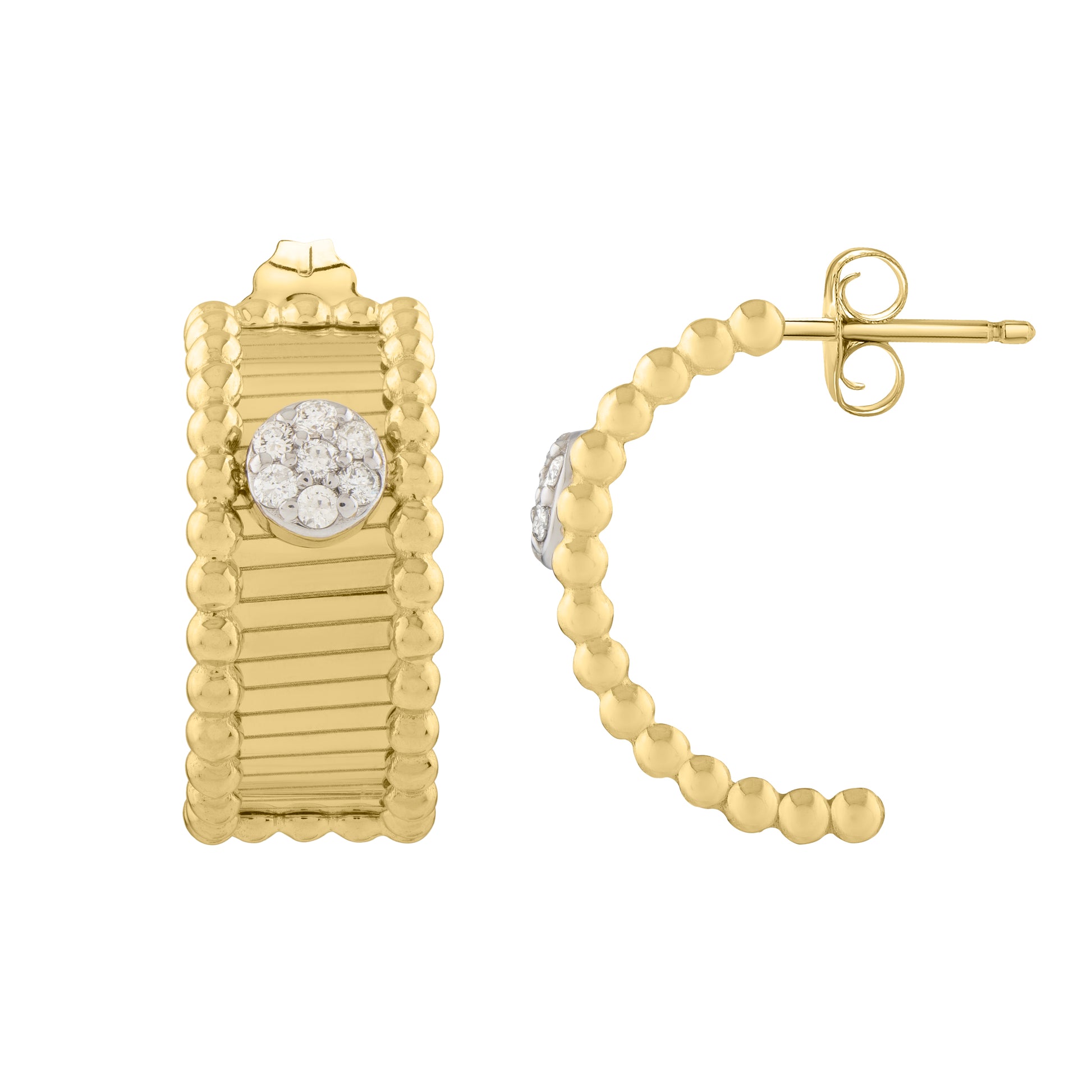 These 14K gold two-tone Pallina half moon earrings showcase masterful craftsmanship with their distinctive bicolor design. Measuring 8.5mm, each earring is adorned with a 0.17ct diamond that catches light beautifully against the interplay of yellow and white gold. The reliable push back clasp provides secure retention for daily wear. An understated yet striking choice for discerning jewelry collectors who appreciate timeless design with contemporary flair.