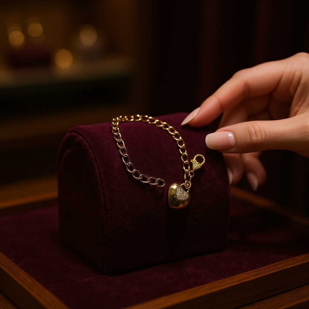 This elegant charm bracelet features a delicate heart charm and sparkling CZ details. Crafted with gold over silver, it adds a touch of sophistication to any outfit. Celebrate love and style with this charming accessory.