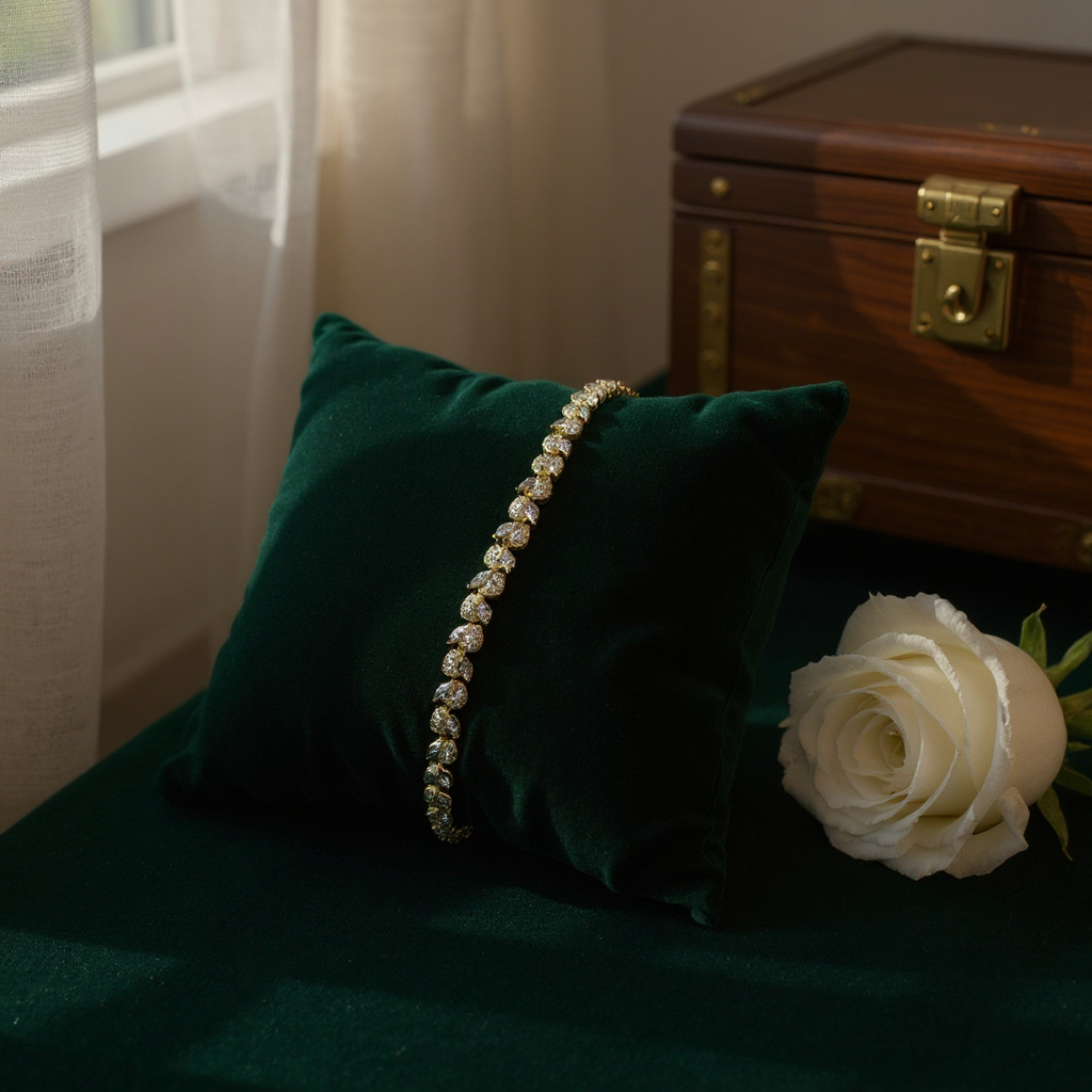 This stunning Love tennis bracelet is crafted from gold over silver, featuring intricate details and sparkling CZ stones. With its elegant design, this bracelet will add a touch of glamour and sophistication to any outfit. Perfect for tennis lovers and a great gift for any occasion.