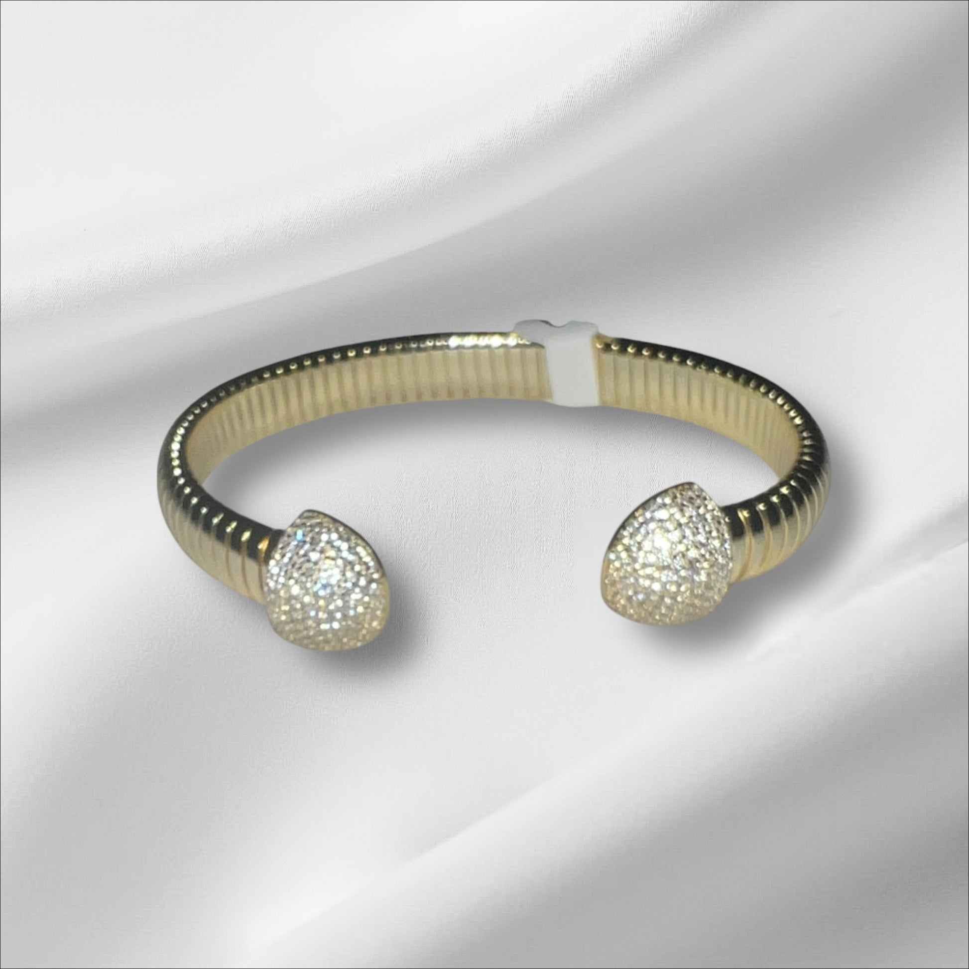 This statement Ribbed Bangle Bracelet is expertly crafted with sterling silver, dipped in 14k gold for an elegant touch. The intricate ribbed design is accentuated by sparkling CZ stones, making it a true statement piece. Elevate your look with this high-quality bangle that exudes sophistication and style.